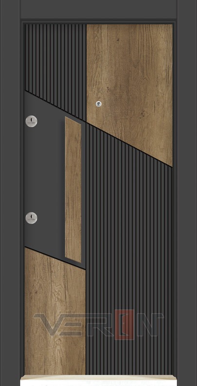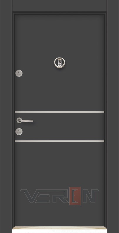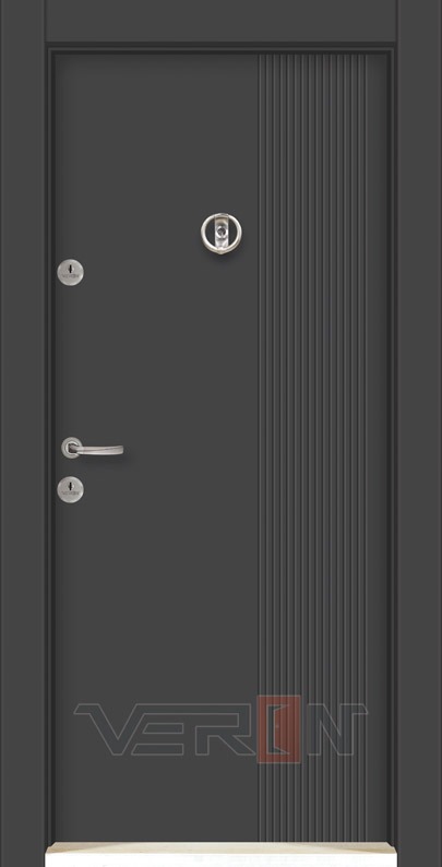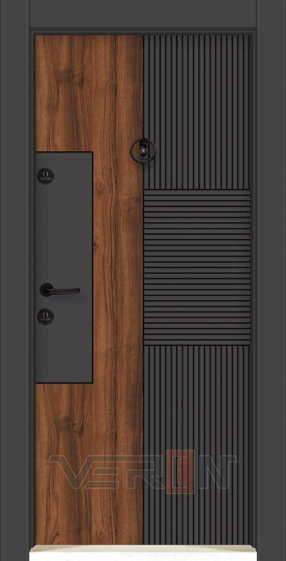 Входна врата, изработена от 1.2мм прахово боядисан метал и 10мм MDF фрезован панел.